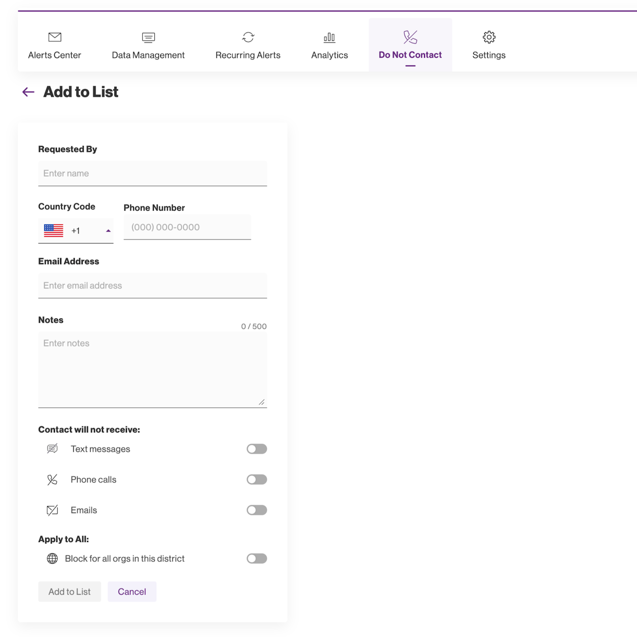 The Do Not Contact list provides a location for you to select one or more contact types to block for a given phone number and/or email address.
