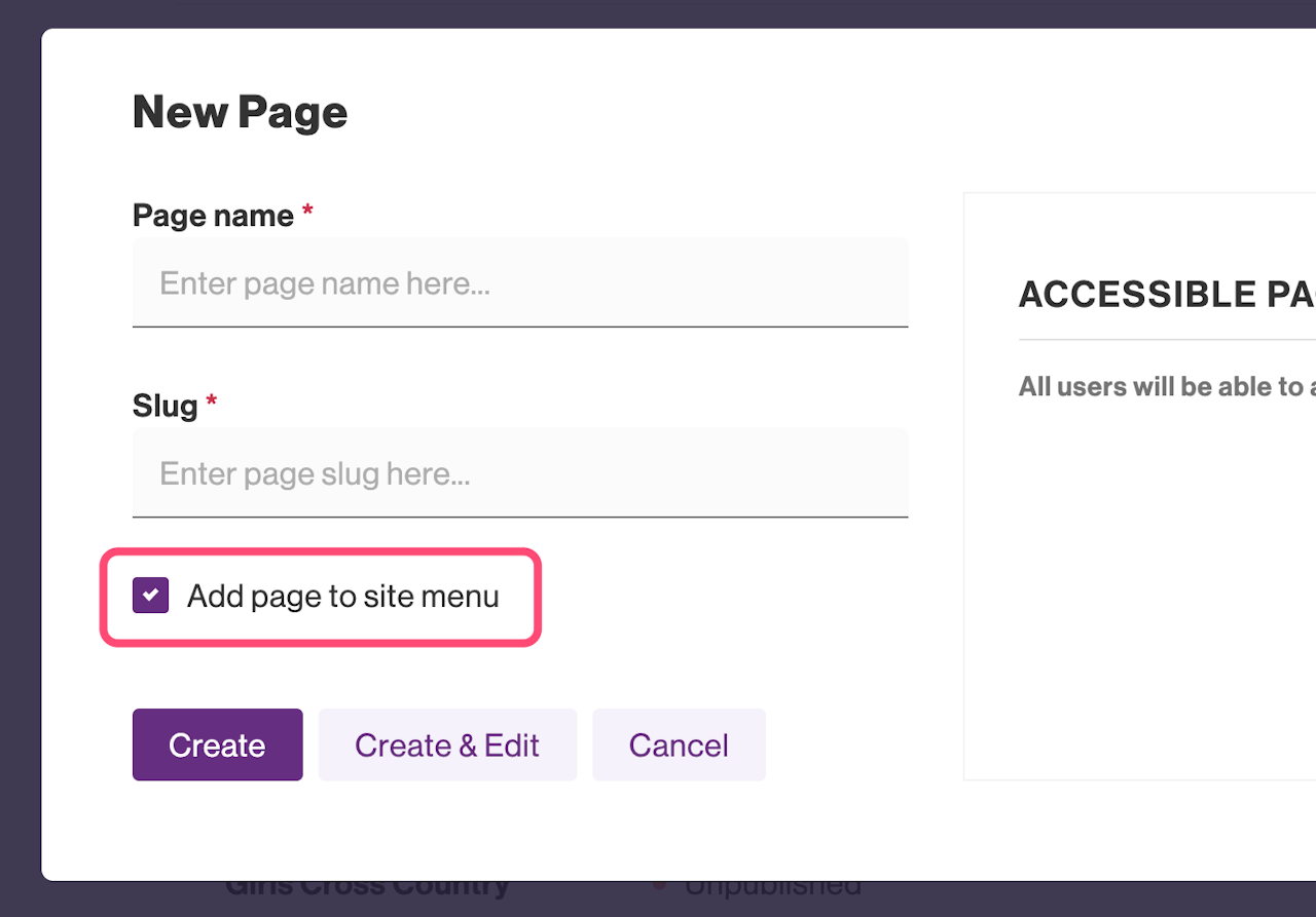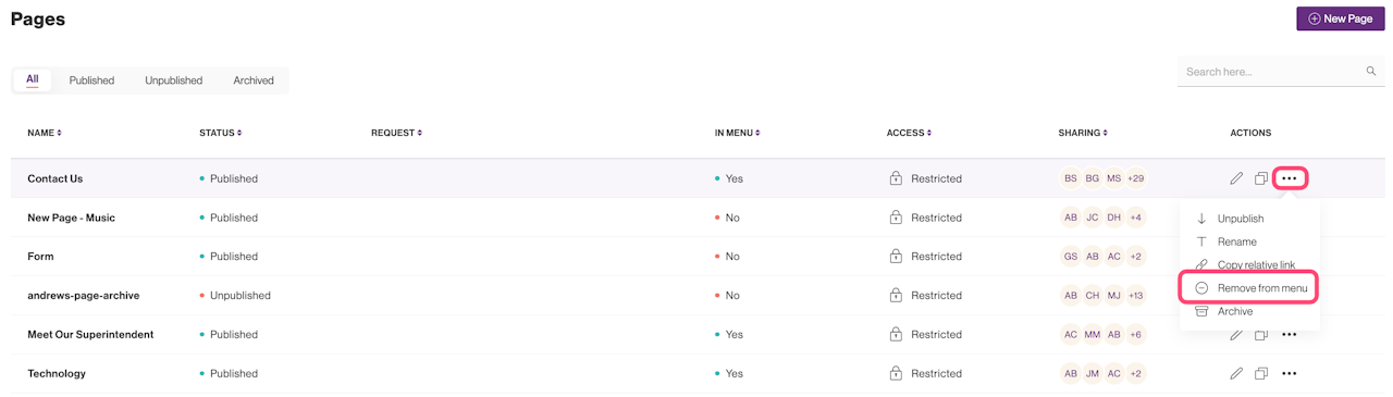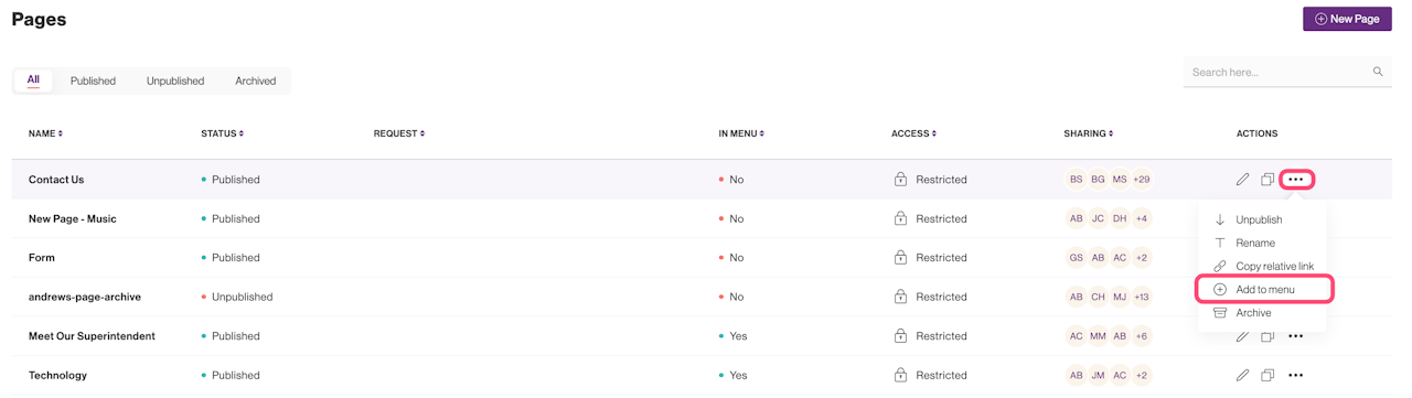 If a page was not added to the Site Menu when it was created, you can add it at any time after by first hovering over the ... option in the Actions column.
