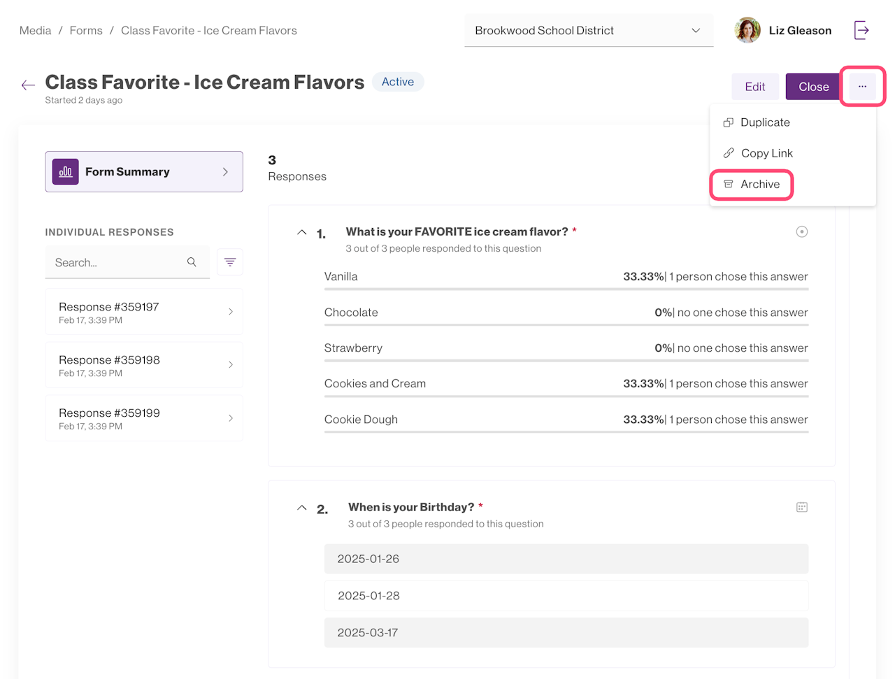 After clicking into your desired form from the forms list, select an an individual response from the left side of the screen. After selecting your response an Archive button will appear to the right of the screen.