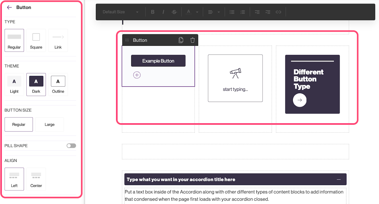 The Buttons section allows you to link out to other important links or URLs with the convenience of clear visibility and purpose for the user.