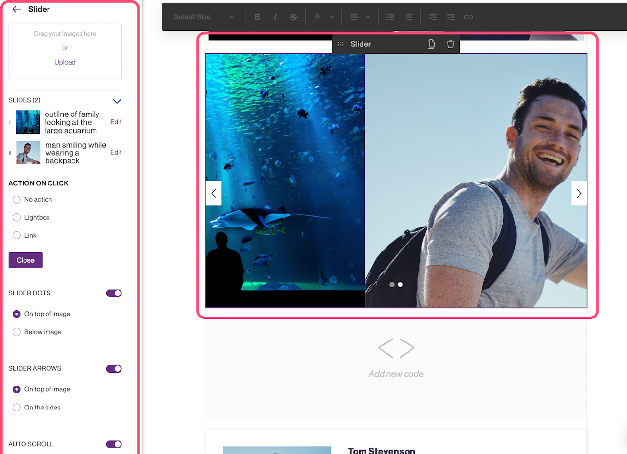 From the editing sidebar you can rearrange the images by dragging, edit the action on click for individual images (edit button), choose the positioning of the slider arrows and pager dots, and turn off autoscroll or set its transition speed if enabled.