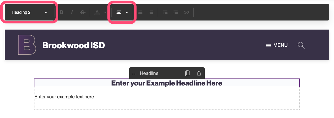 Header uses the standard HTML heading tags (H1-H5) to allow you to create heading and sub-headings on your page. You can set the heading level and alignment by selecting the headline text.