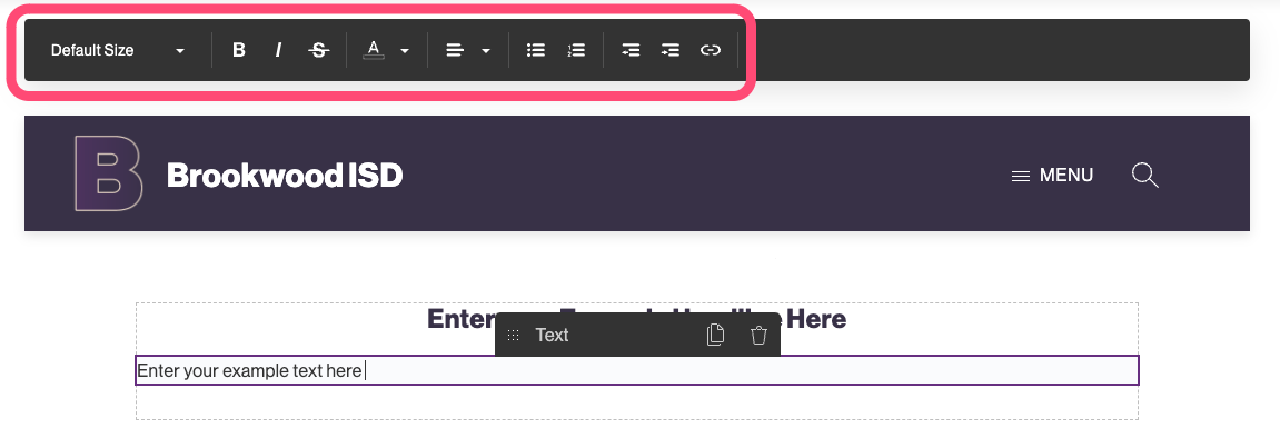 Text is the main content block you can use to add text to your site. Text can be formatted once added by selecting it and choosing from the options on the editing bar that pops-up: code formatting (display only), bold, italics, strikethrough, ordered and unordered lists, alignment, font size, and links.