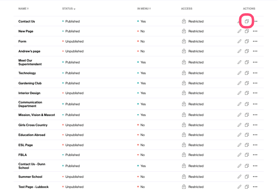For every created page a duplication icon exists on the right side of the screen under the "Actions" section.