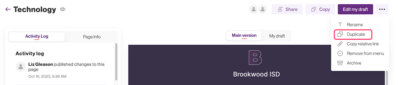 Duplicate pages will maintain the same contents and layout of the page being duplicated. Pages will maintain the same status (Draft, Published) and will be added to the Sites Menu if the original page is already in the menu.