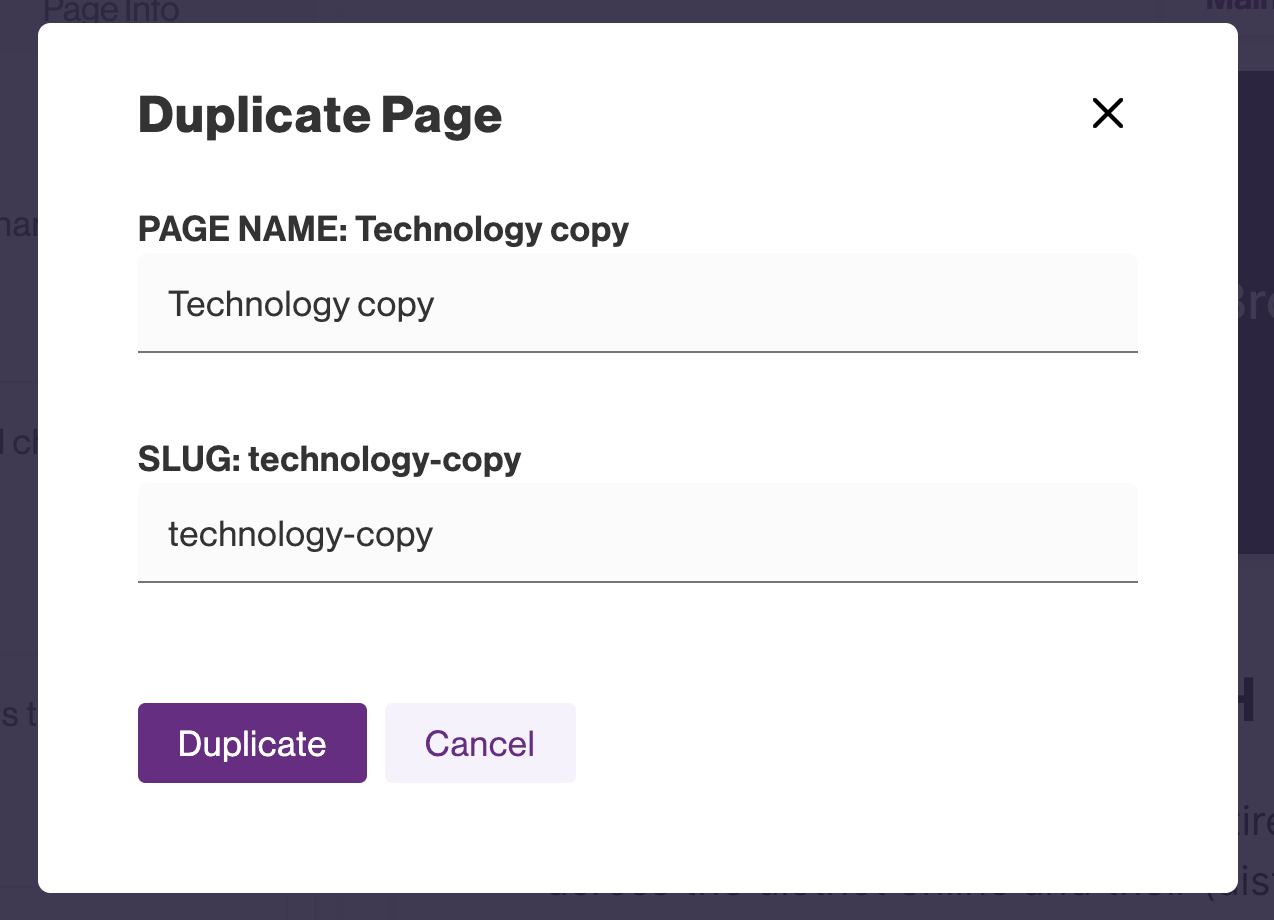 Once either option above is clicked, a popup box will appear with both the existing page name and slug fields pre-modified with "copy" added. At this time you can edit both fields to to your liking.
