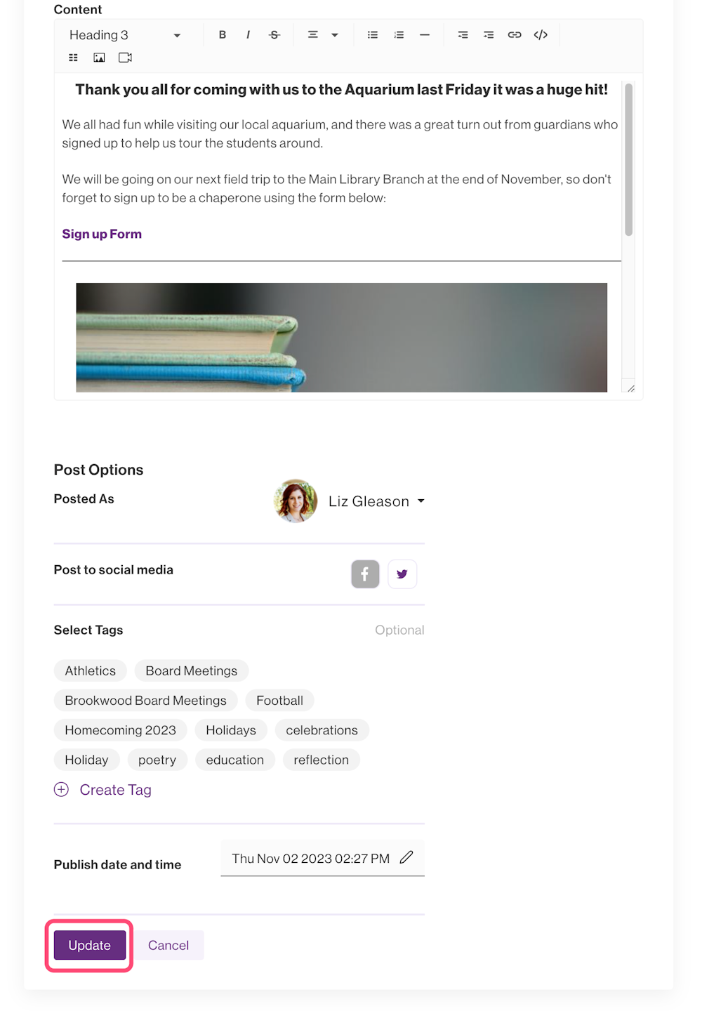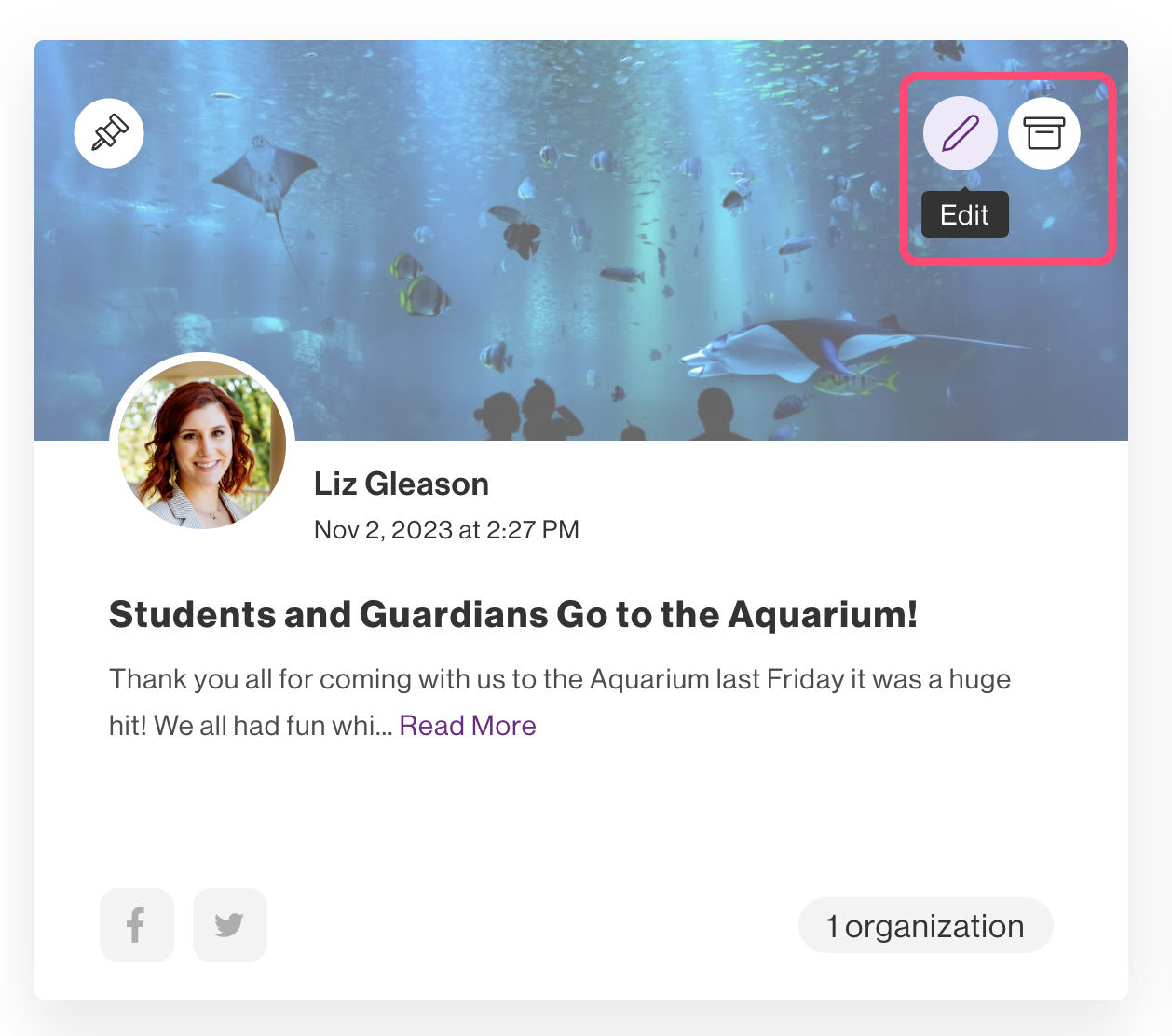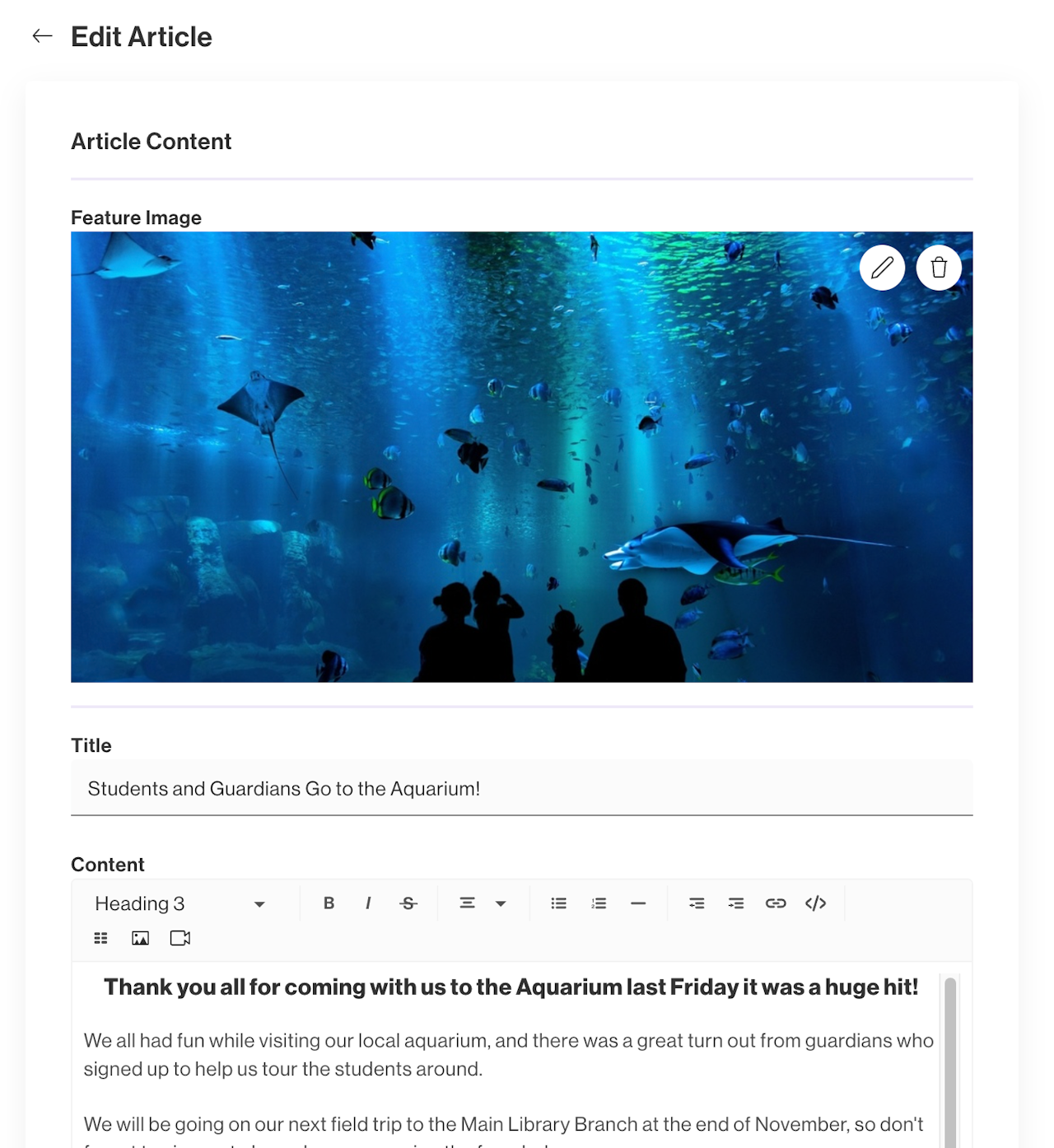 To edit a News article, hover your cursor over the News article you intend to edit. Two icons will appear on the right-hand side: a pencil icon, and a box icon. Click the pencil icon to edit the article.