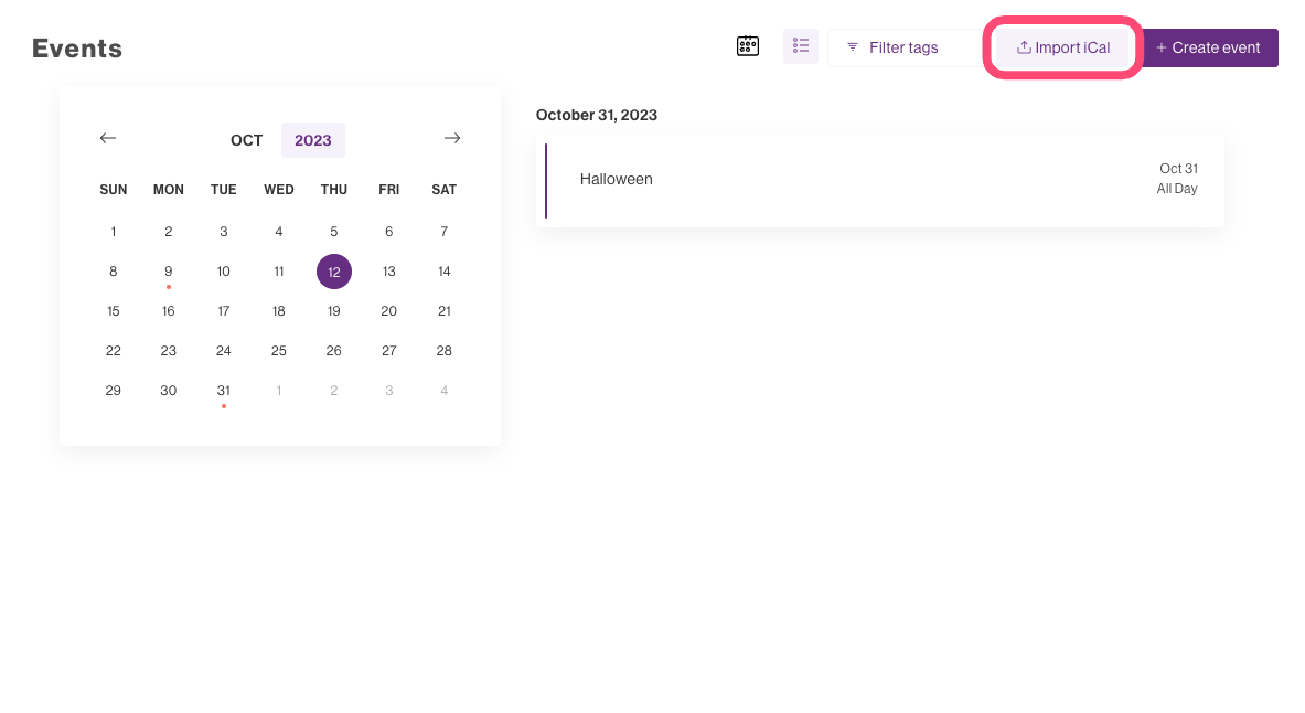 1. While in the Events section of Thrillshare, click the "Import iCal" button to browse your computer for the iCal or ICS file you would like to upload.