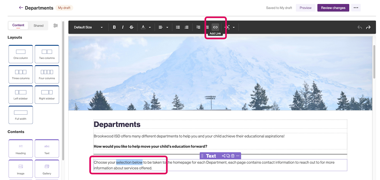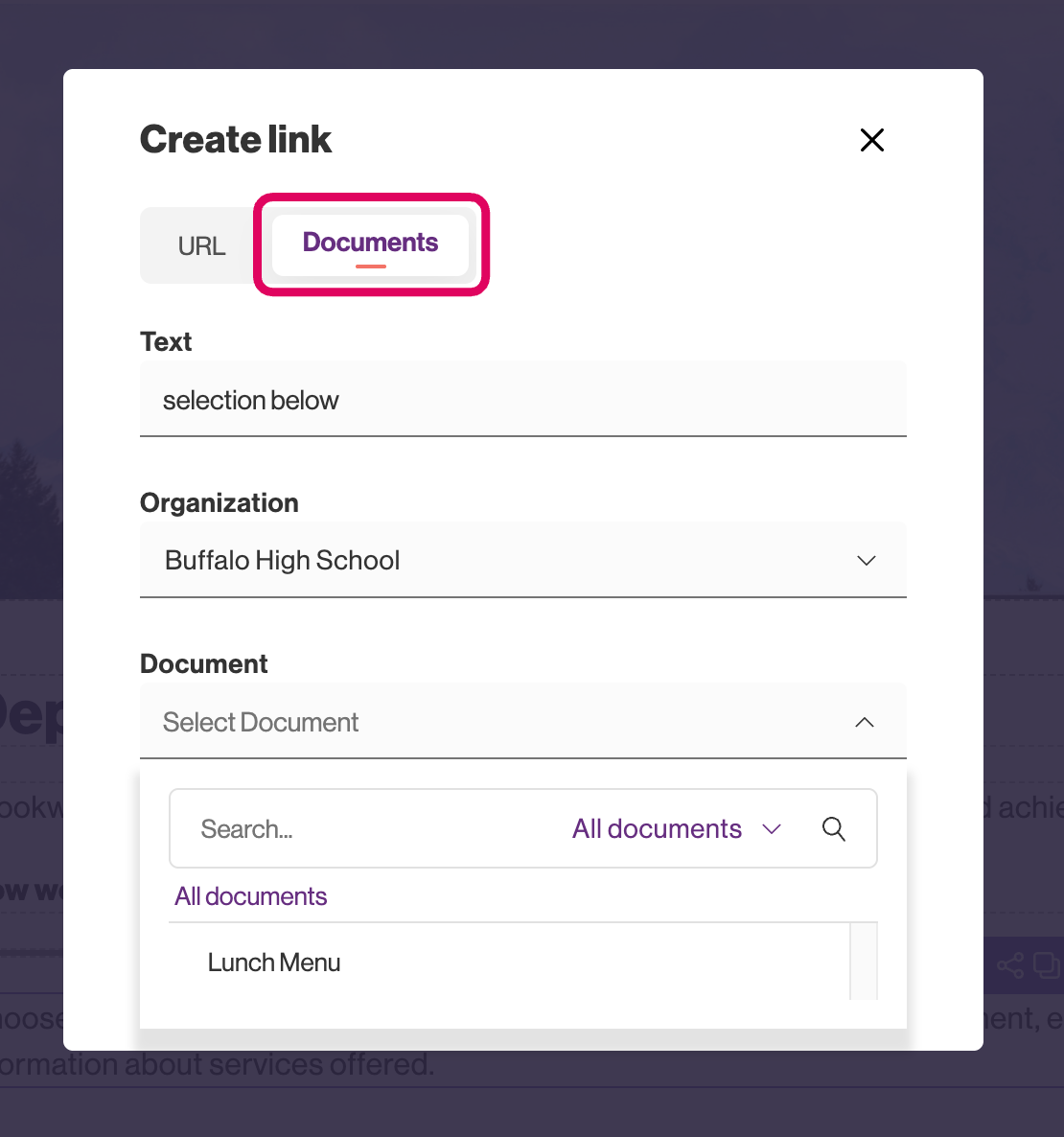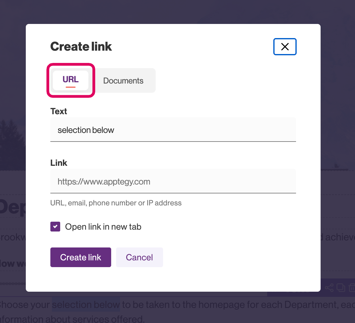 Within the Documents tab, if you highlighted text before clicking the link icon it will already have the words you highlighted in the text section. If you clicked the link icon without highlighting, add whatever text you would like to the text field.