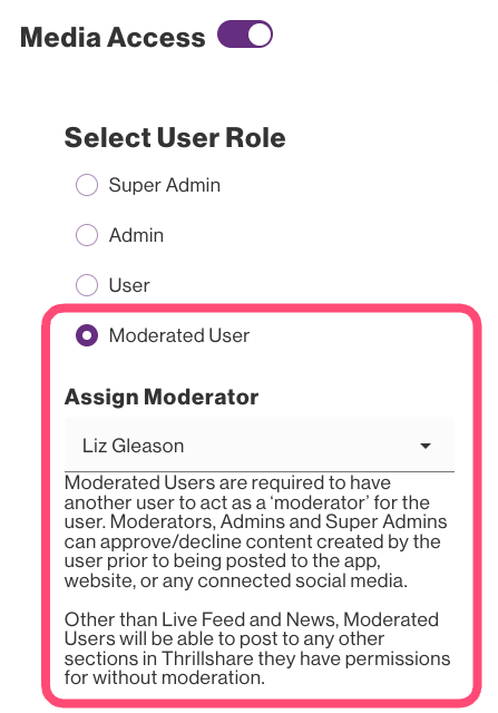 The Moderated User is a role within Thrillshare that requires approval for anything posted to Live Feed and News prior to being posted to the app, website, or any connected social media.