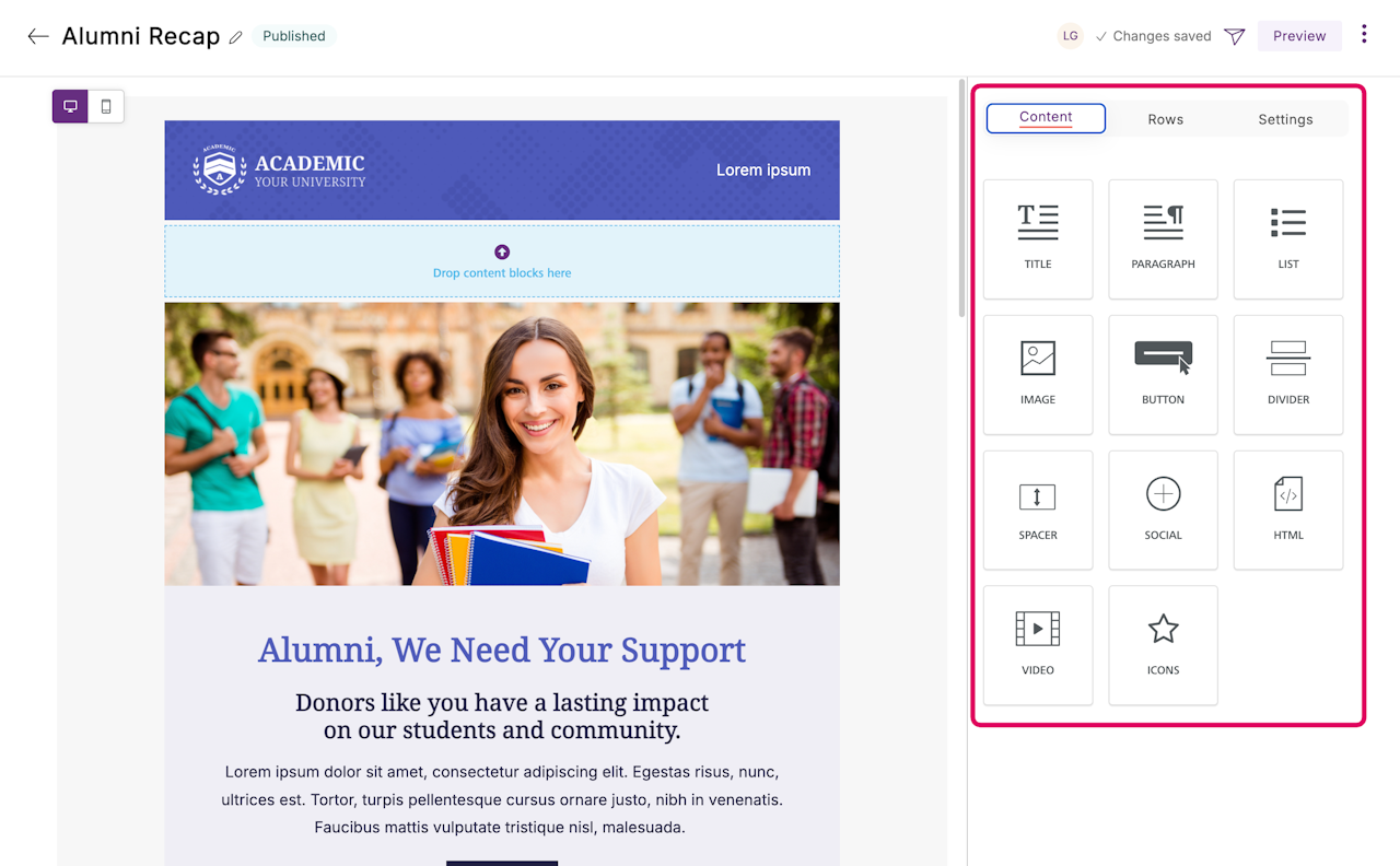 Once added to a Newsletter, both Rows and Content can be easily rearranged by dragging and dropping them.
