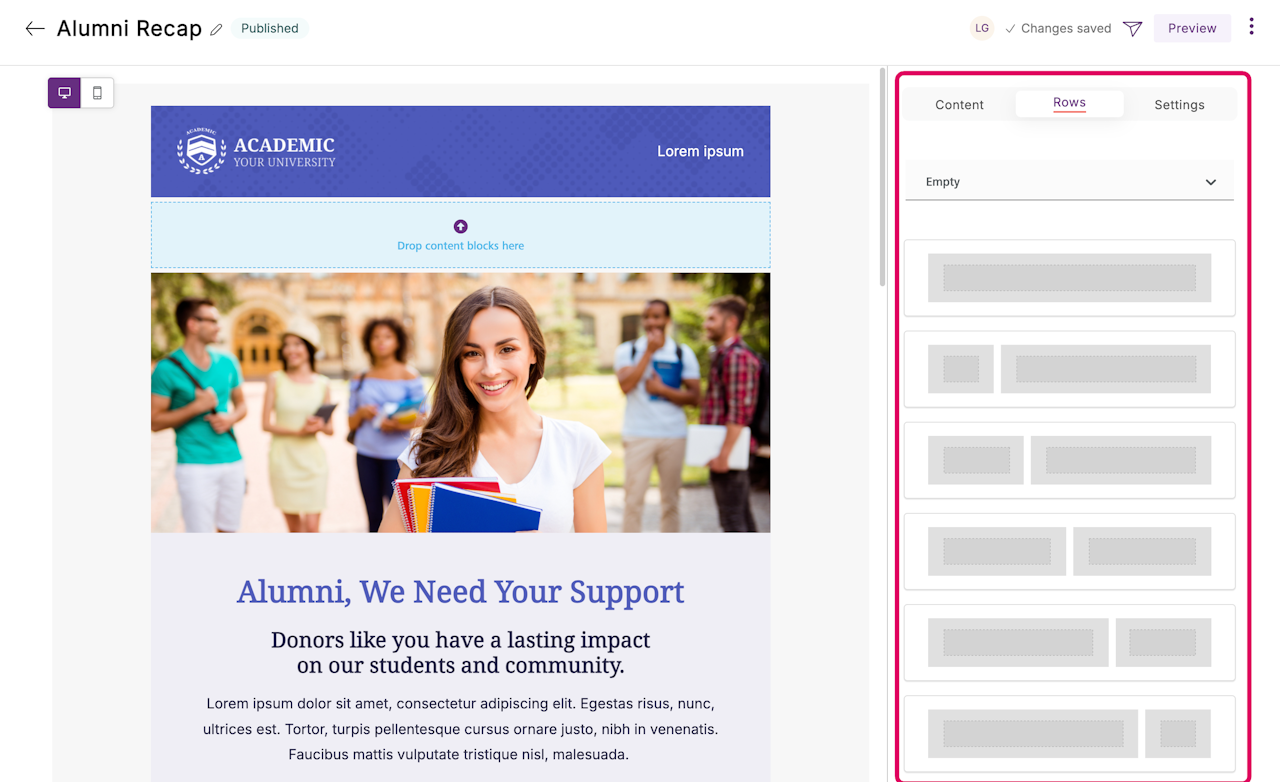 The Rows tab allow users to create multi-column layouts. Layouts can be stacked on top of one another, or nested inside of one another, to create your Newsletter.