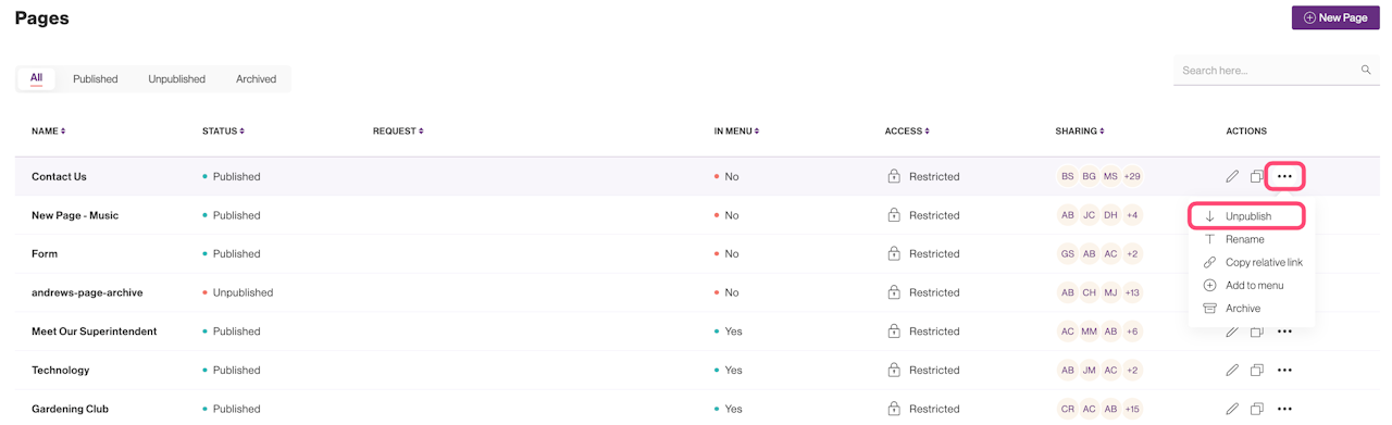 In the Pages Menu or Site Menu, Hover over the ... option in the Actions column. From the dropdown that opens, select either Publish or Unpublish depending on the current status of the page.