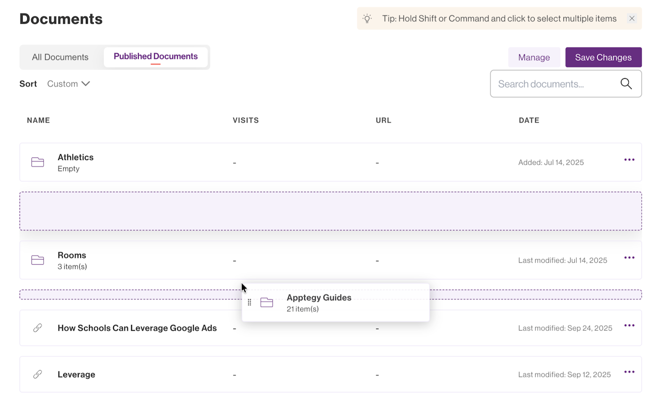 Files, Folders and Links can be reorganized within the Published Documents tab.