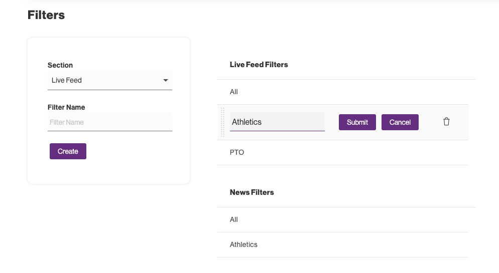 When hovering over a filter name, a trashcan icon will appear to the right of your selection. Once this selected, you will be prompted to make sure you would like to delete the selected filter.