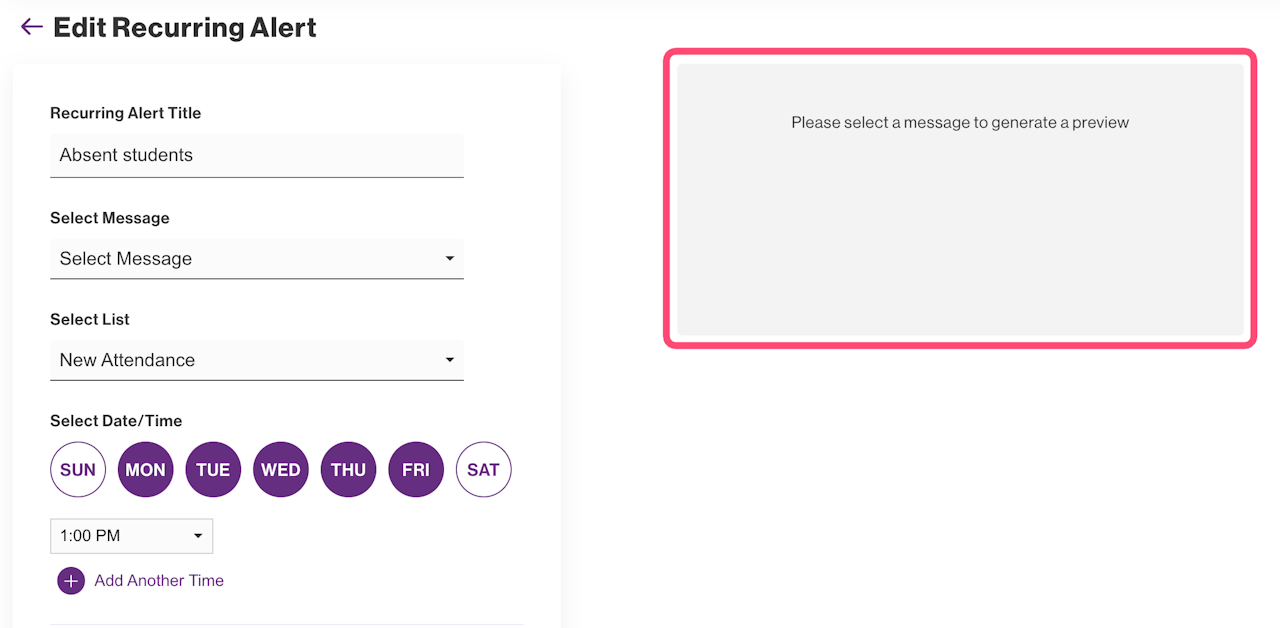 Next, fill out the Recurring Alert Title, and below it, select the personalized message that was created previously.
