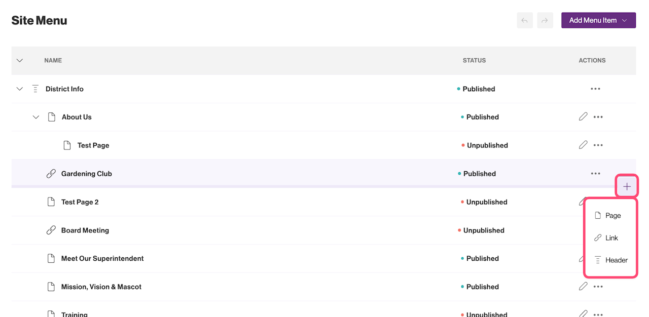 Rearrange - CMS pages on the Site Menu can be reordered, which includes being able to nest items under other headers. The buttons to the left of the Add Menu Item button can be used to undo and redo changes in the site menu.