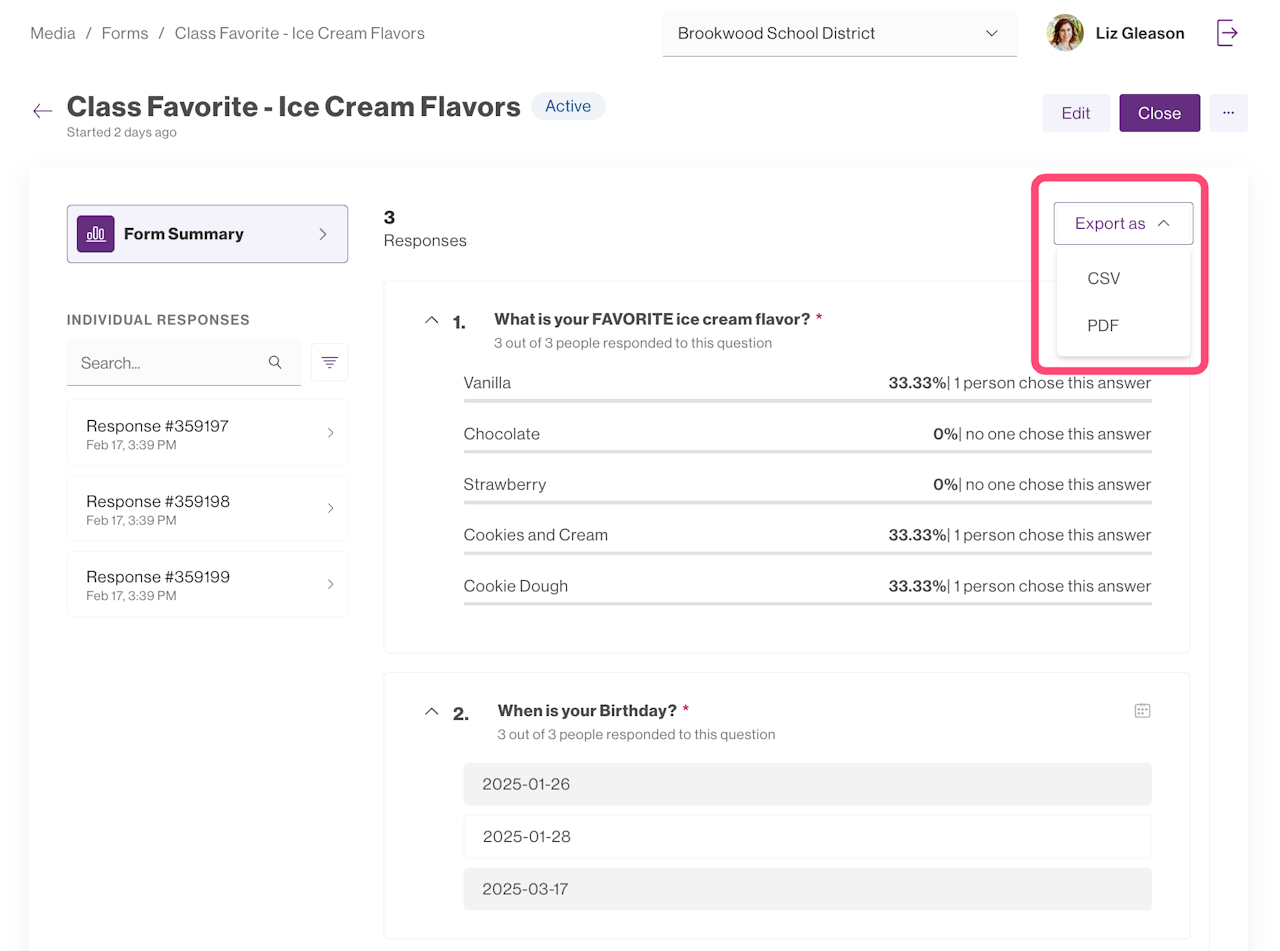 The detail view will display the current responses to each of your questions, and allow for exporting those responses to CSV and PDF files.