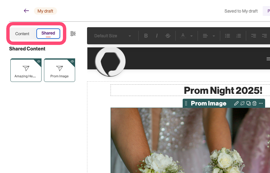 While only specific roles can create a shared component, all other users have the ability to view and incorporate existing shared content onto the pages they are building.