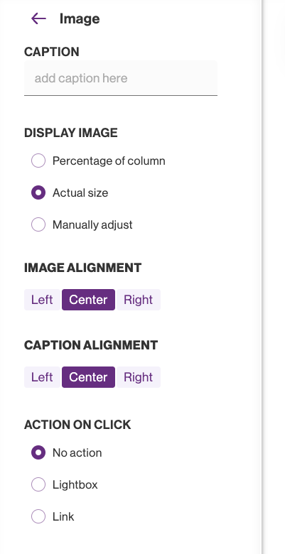 The Image element allows you to add a standalone image to your page. Once an image is added, from the editing sidebar, you'll be able to add a caption, set the image size and alignment, and add an action on click (light-box or link).