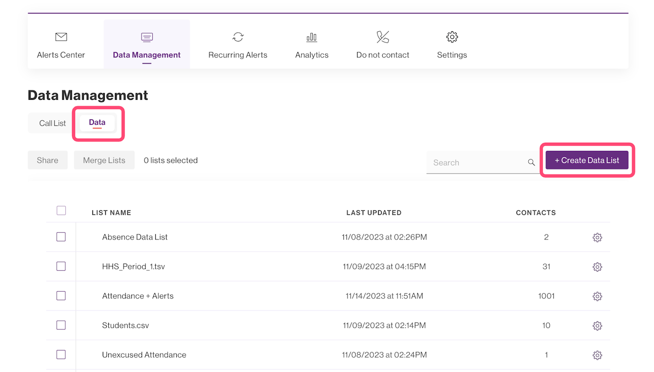 Click on the + Create Data List button on the right side of the screen screen.