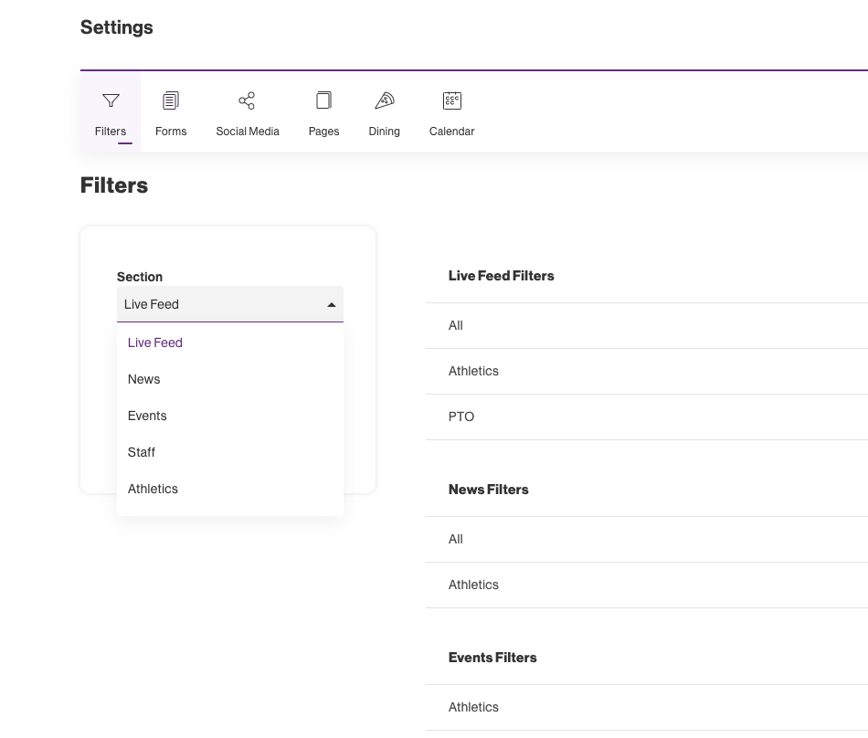 Filters can be created to narrow down content in Live Feed, News, Events, Staff, and Athletics.