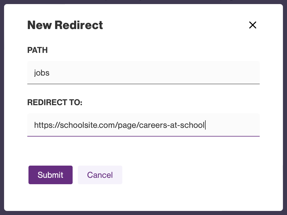 Path - This is the slug that will be appended to your domain to create the redirect address. Like the slug of a page, it only allows letters, numbers, and dashes. For example - if you want the page https://thrillshare.net/jobs to be your redirect, you would enter jobs in this first field.