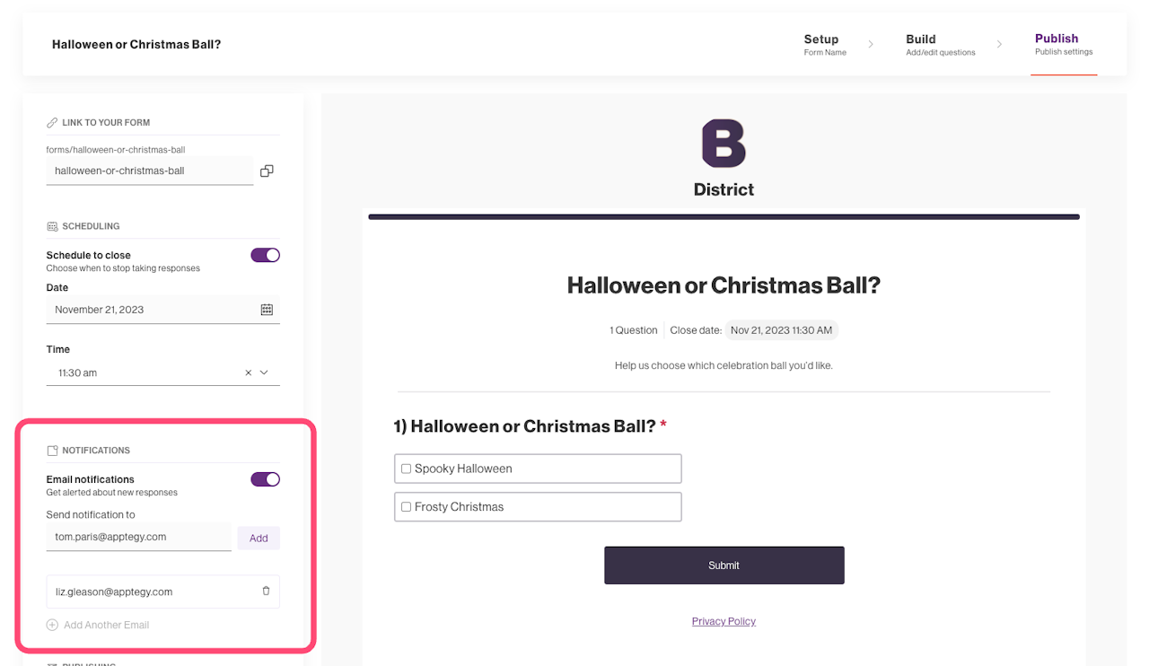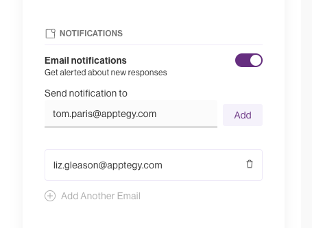 If you would like to receive email notifications for new responses, you can add your email in the "Publish" settings during the final steps of form creation. If a form is already published, you can still add your email by clicking on the form and toggling the notify option: