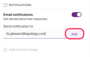 You can add multiple email addresses to receive a notification each time a form has received new responses. Toggle on the Notifications option, type the recipient's email, and then click the Add button. In order to add additional recipients, select +Add Another Email.