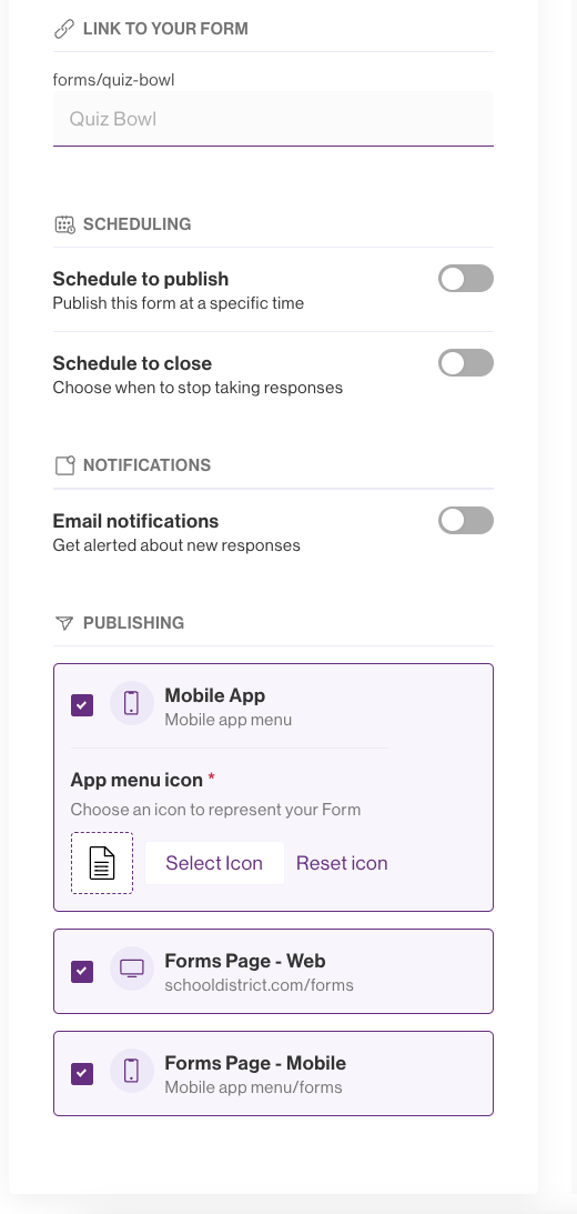 You can designate a publication date and close date to identify a window in which your community can respond to a Form. These items are not required in order to share a Form. The Form will stop accepting responses after the close date.