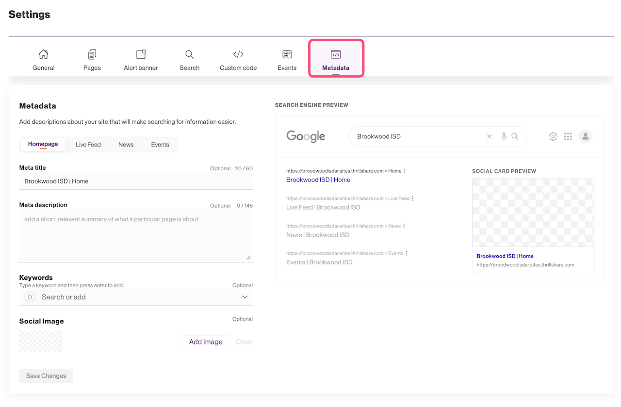 Metadata Titles, Descriptions, Keywords, and Social Images are available to edit for the Homepage, Live Feed, News, and Events sections to help with how your website appears in search results.