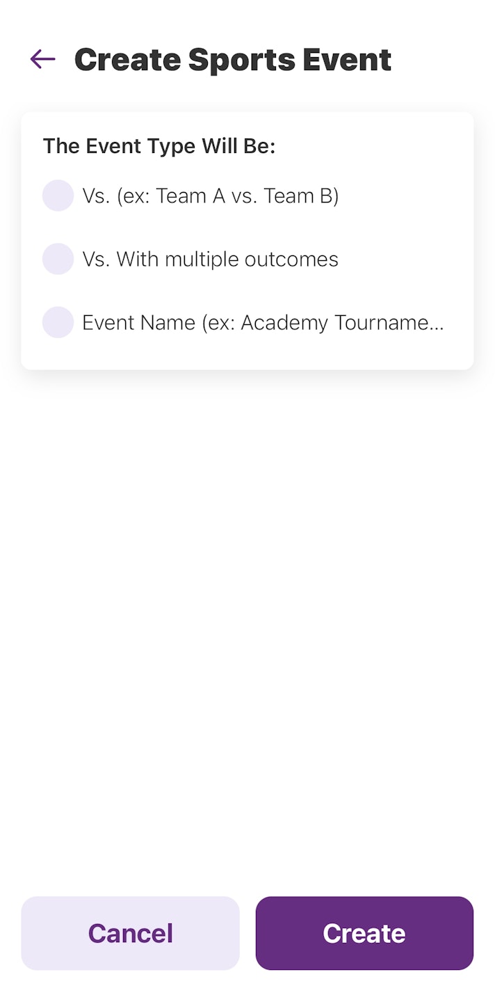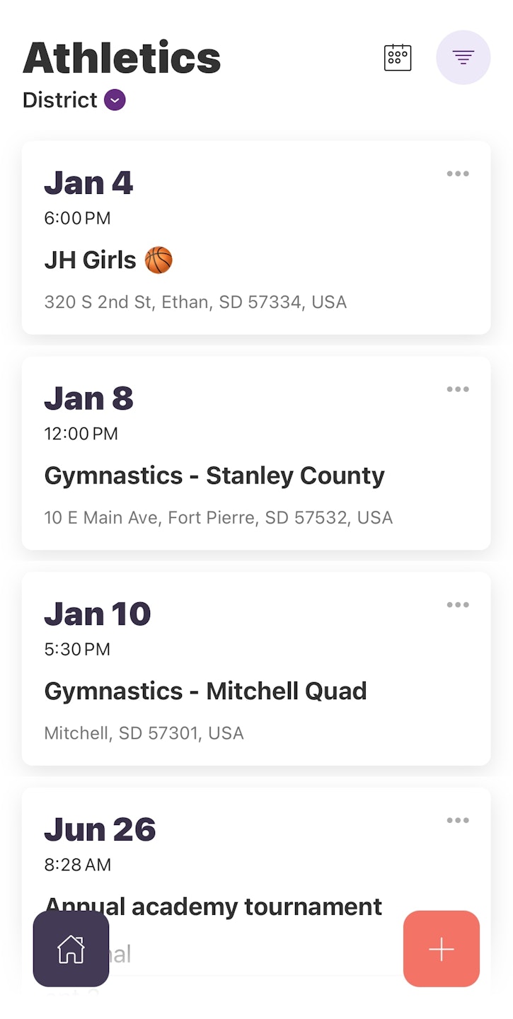 Once Athletics is selected, a screen showing upcoming athletic events in a list will appear, click the orange + button in the bottom right corner of the screen and select Create Sports Event