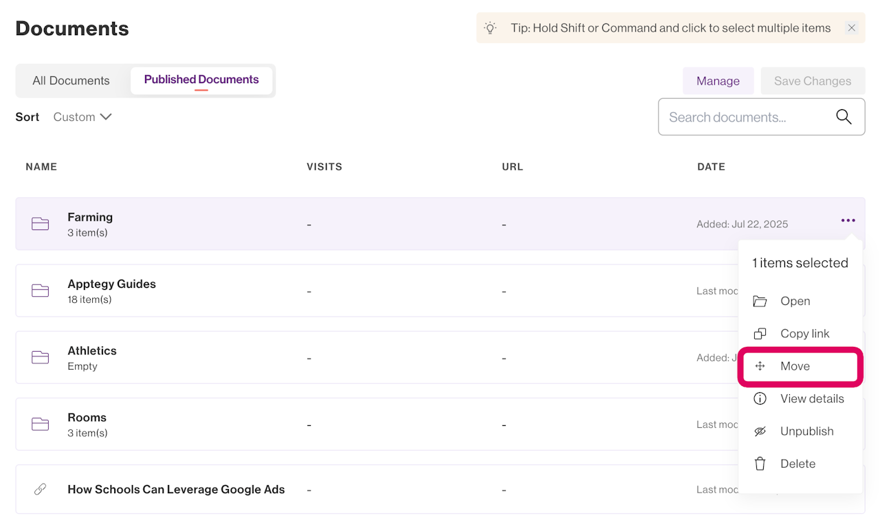 To move files or folders to another folder click the ... icon that appears on the right side of a folder, file, or link within the All Documents tab or Published Documents tab.