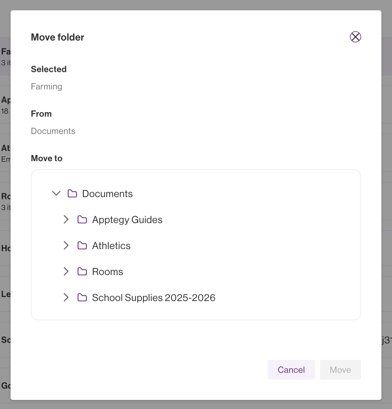 A popup will appear that contains the name of the selected folder or file, where it is moving from, and a file structured list that allows you to choose where the new file location will be.