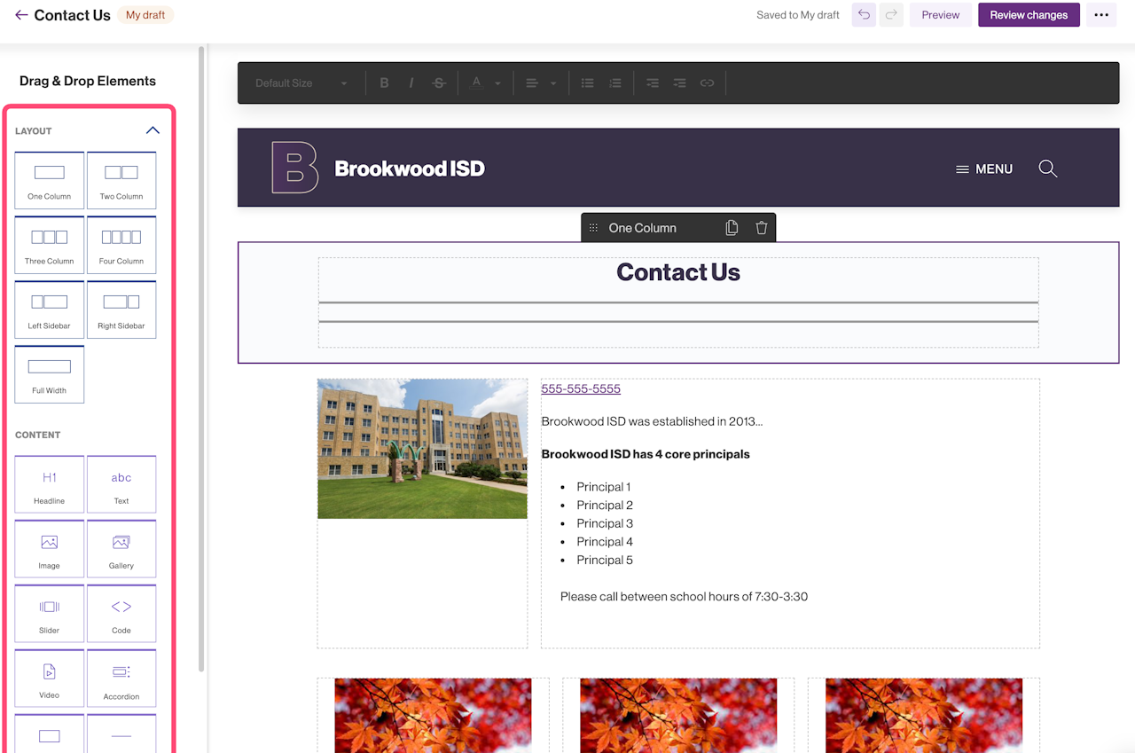 Once added to a page, both Layout and Content elements can be easily rearranged by dragging and dropping them. Content elements can also be moved from one Layout element to another.