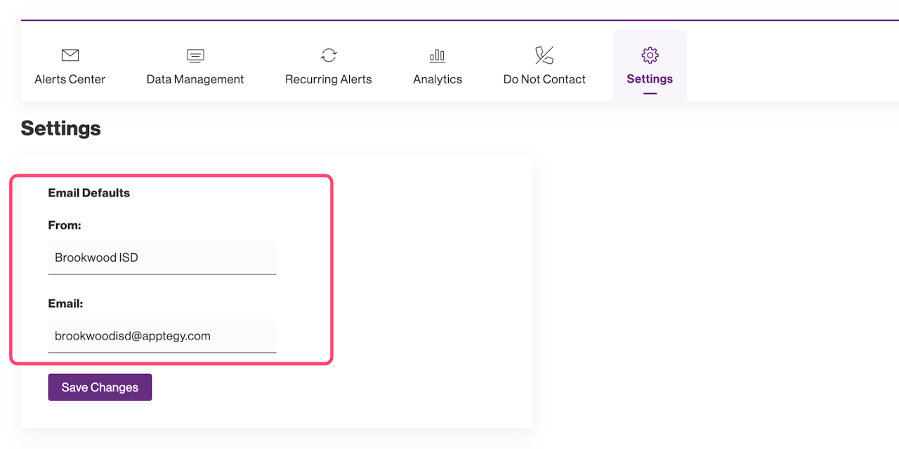 Add your organizations name to the From: field under Email Defaults, then add an email address to the Email: field.