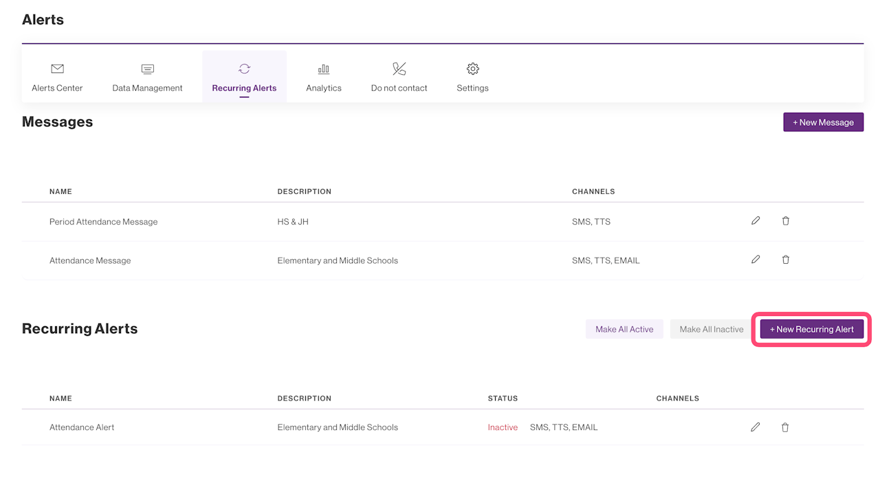 Click on the + New Recurring Alert button under the Recurring Alerts tab in the Alerts section.