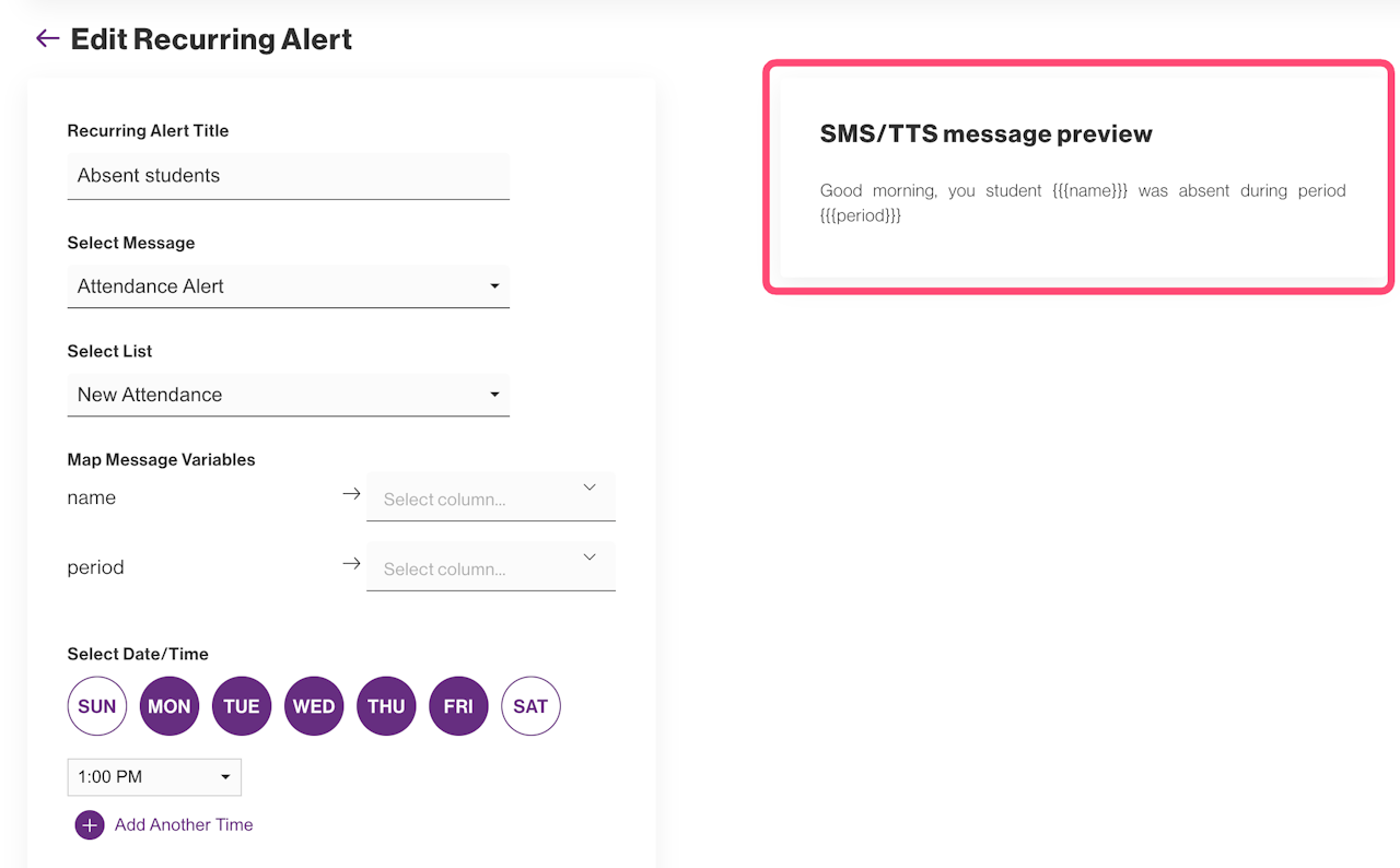Next, fill out the Recurring Alert Title, and below it, select the personalized message that was created previously.