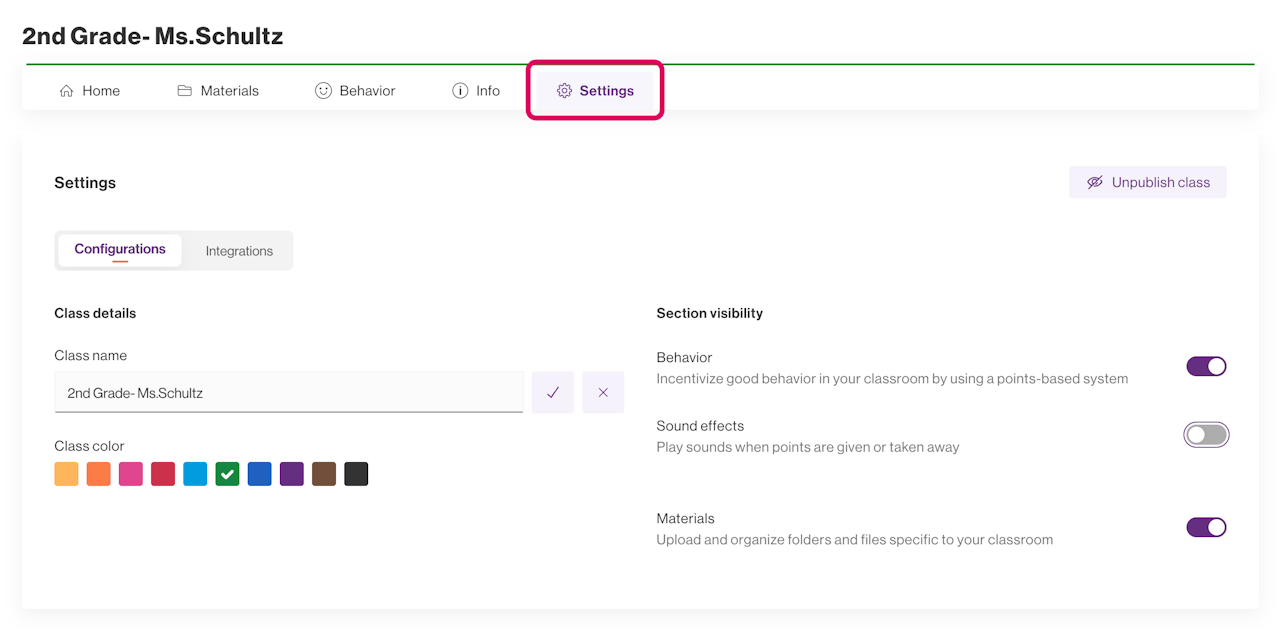 A Settings panel is available in each room and allows you to customize details within each class. Choose from the options below to learn more about different types of customizations available:
